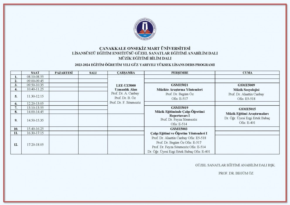 MUSIC EDUCATION MASTER DEGREE COURSE PROGRAM (Fall Semester)