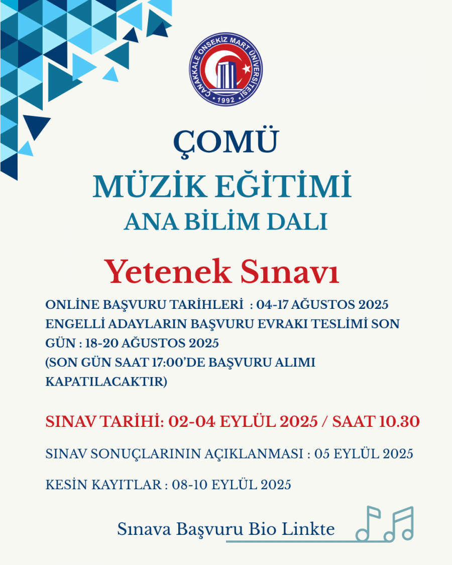 Çanakkale Onsekiz Mart Üniversitesi, Eğitim Fakültesi, Güzel Sanatlar Eğitimi Bölümü, Müzik Öğretmenliği Lisans Programına Özel Yetenek Sınavı ile öğrenci alınacaktır.